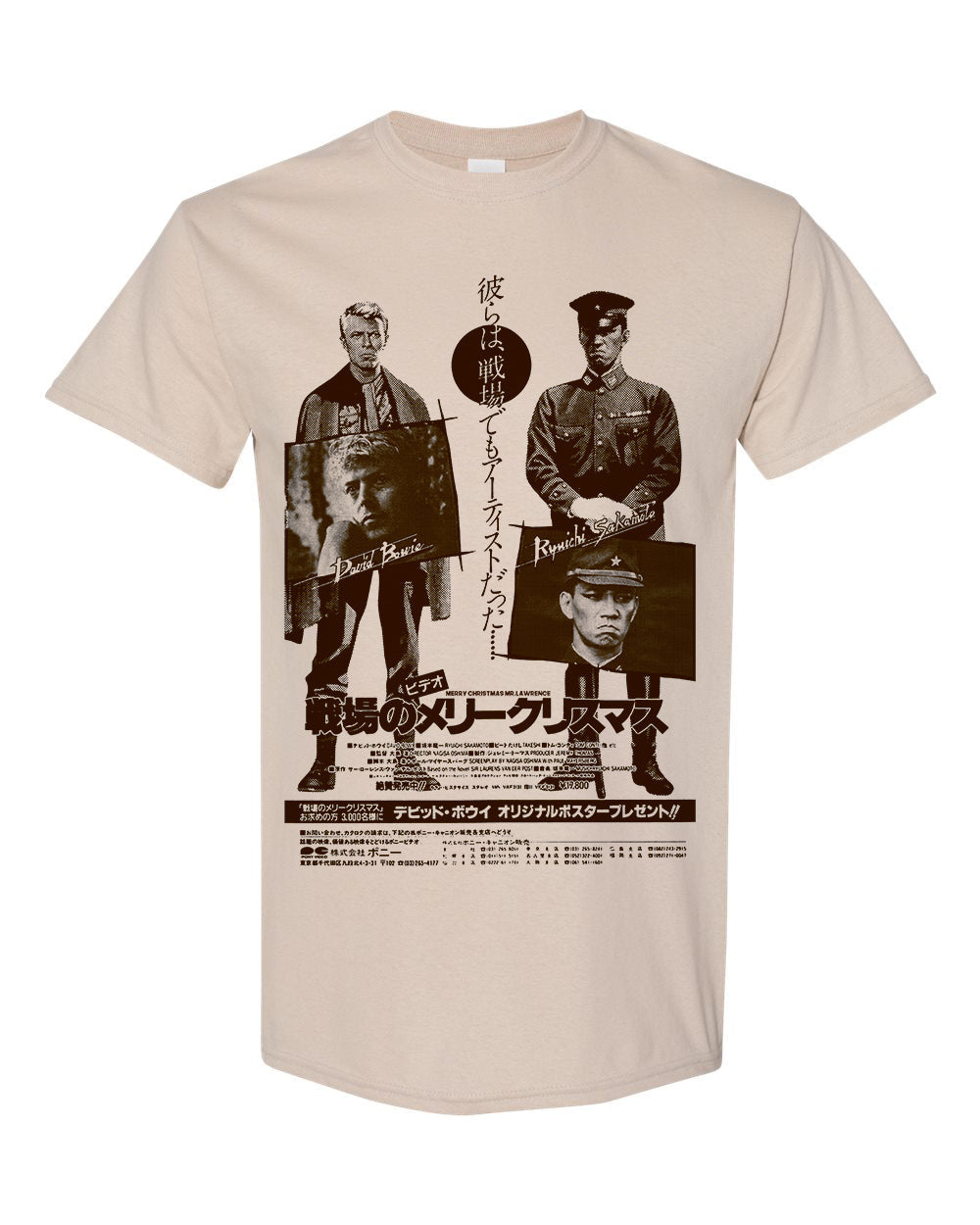 Tribute t-shirt to the classic 1983 film Merry Christmas Mr. Lawrence directed by Nagisa Ōshima and starring David Bowie and Ryuichi Sakamoto who also composed the soundtrack.