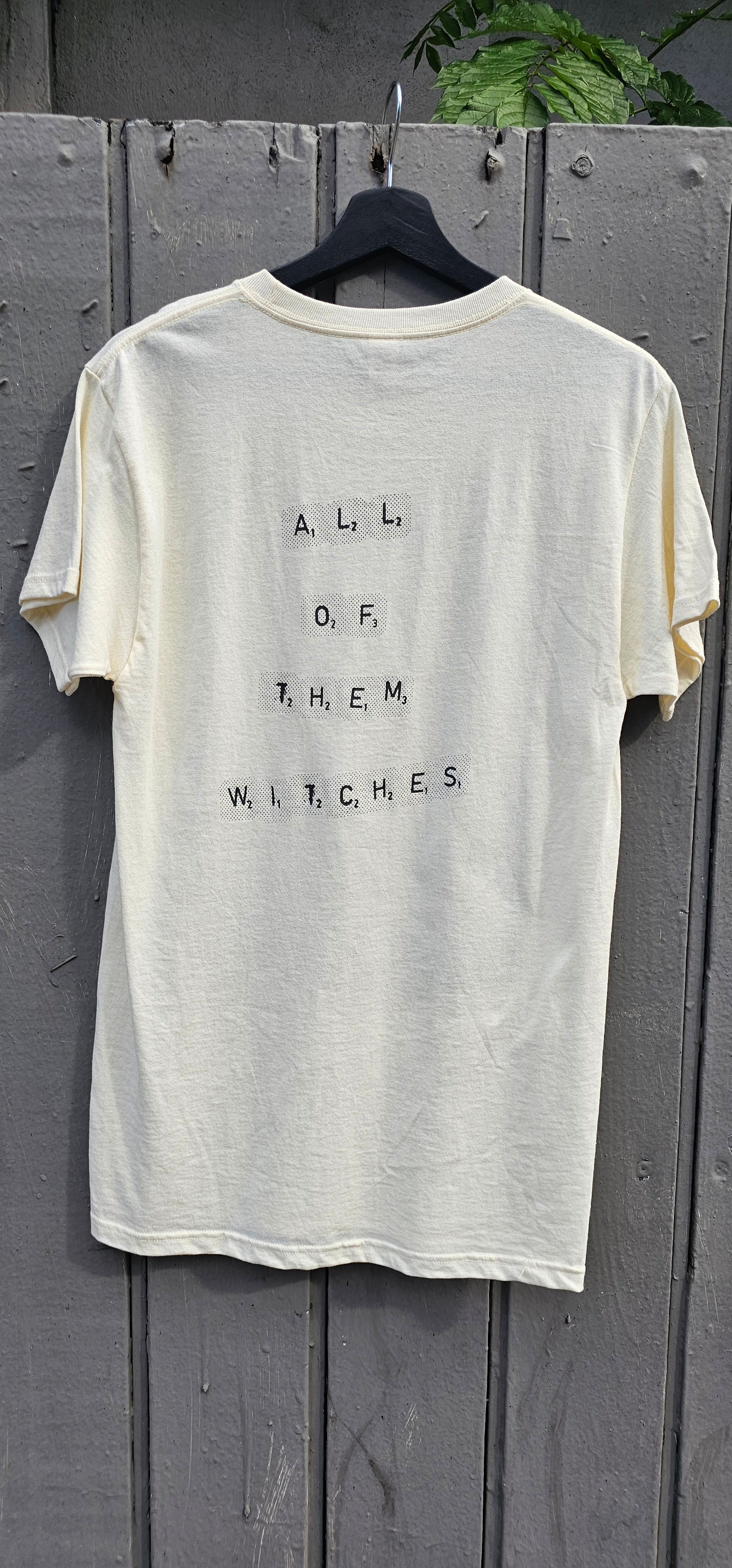 Printed in 2 color silkscreen front with Japanese version of the poster and back reads "All of them Witches" in scrabble letters