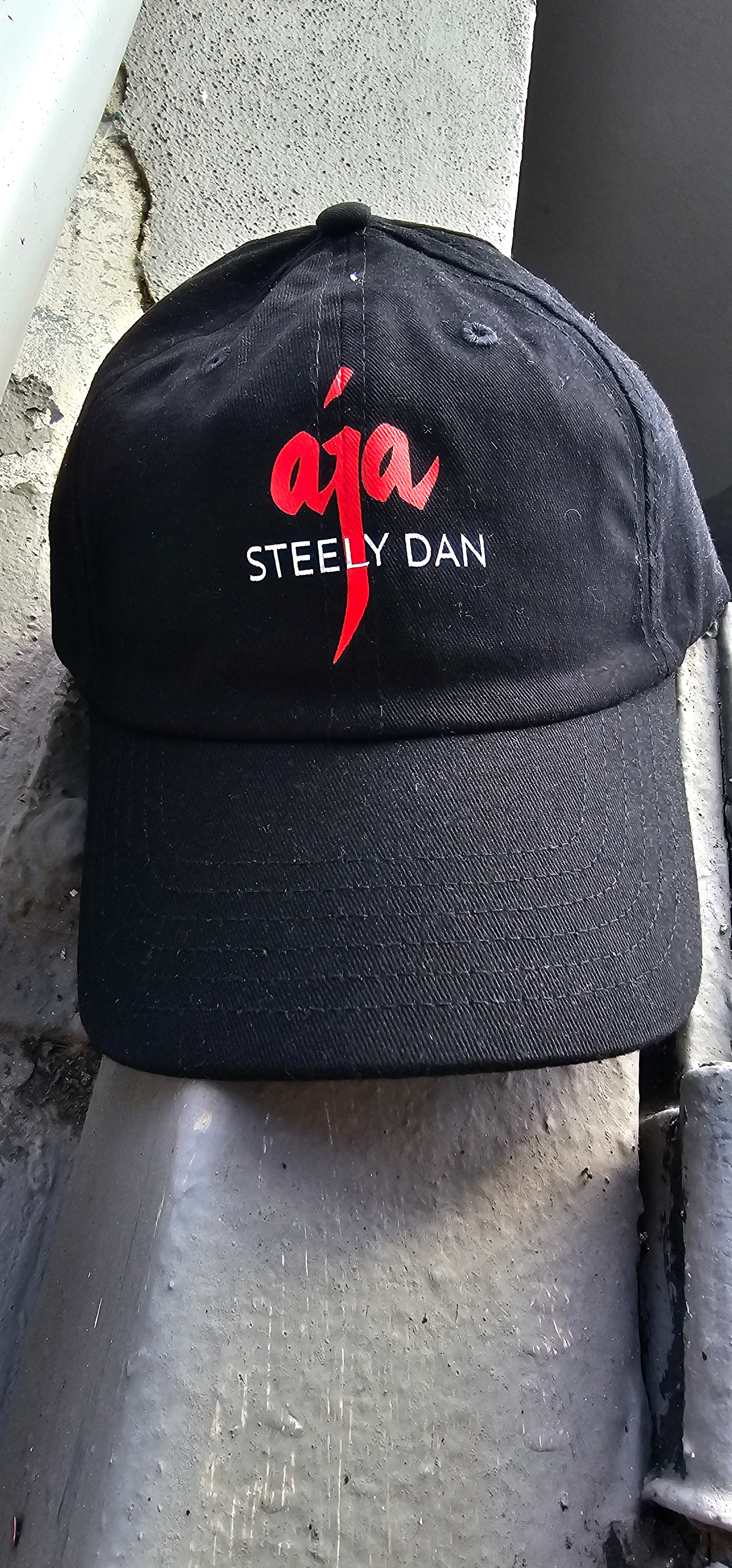 Unstructured cap in black printed with Steely Dan's seminal record "Aja"