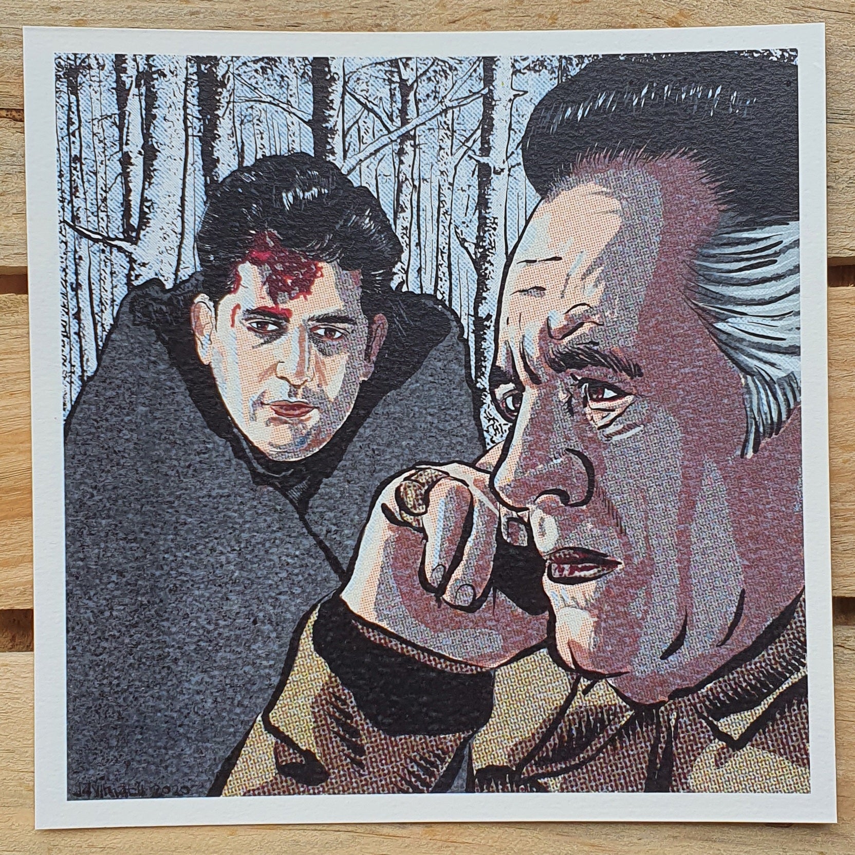 Pine Barrens is highly considered one of the most praised episodes in the Sopranos. This print highlights Paulie and Christophers misadventures stuck in the snowy Pine Barrens. Quality print in 140lb Cold Press Watercolor Paper, 9"x9" signed and limited prints.